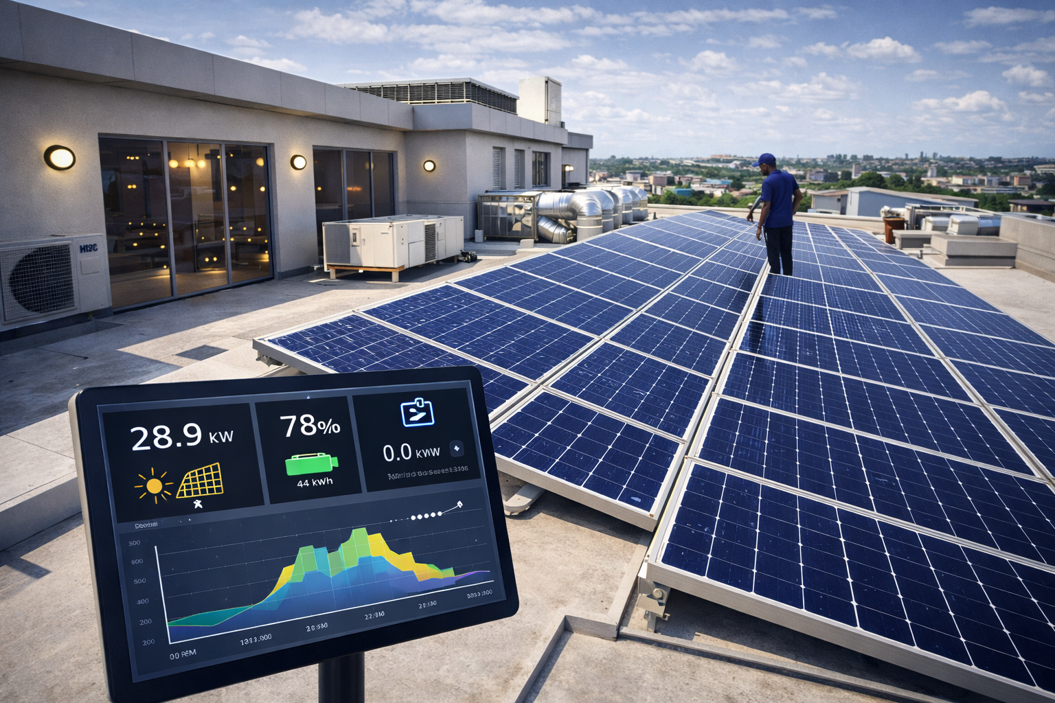 Some event centers pair solar with their existing generator systems. Solar powers daytime loads while the generator kicks in during high-demand or low sunlight conditions.